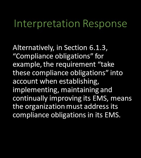 The second example relates to Clause 6.1.3, “Compliance obligations”, where the requirement is for the organisation to “take these compliance obligations into account when establishing, implementing, maintaining and continually improving its EMS, means the organization must address its compliance obligations in its EMS.