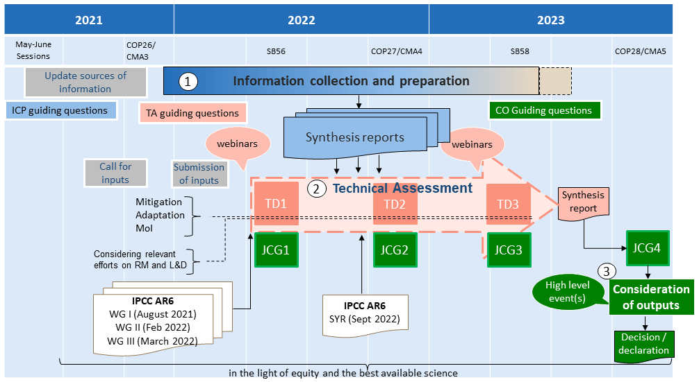 COP26 will be at the near start of the Global Stocktake process. In the diagram, the timelines of the three components of the first global stocktake – information collection and preparation in late 2021 towards 2023, technical assessment spanning a similar timescale and consideration of outputs, and some of its inputs and mandated activities for COP28 in 2023.