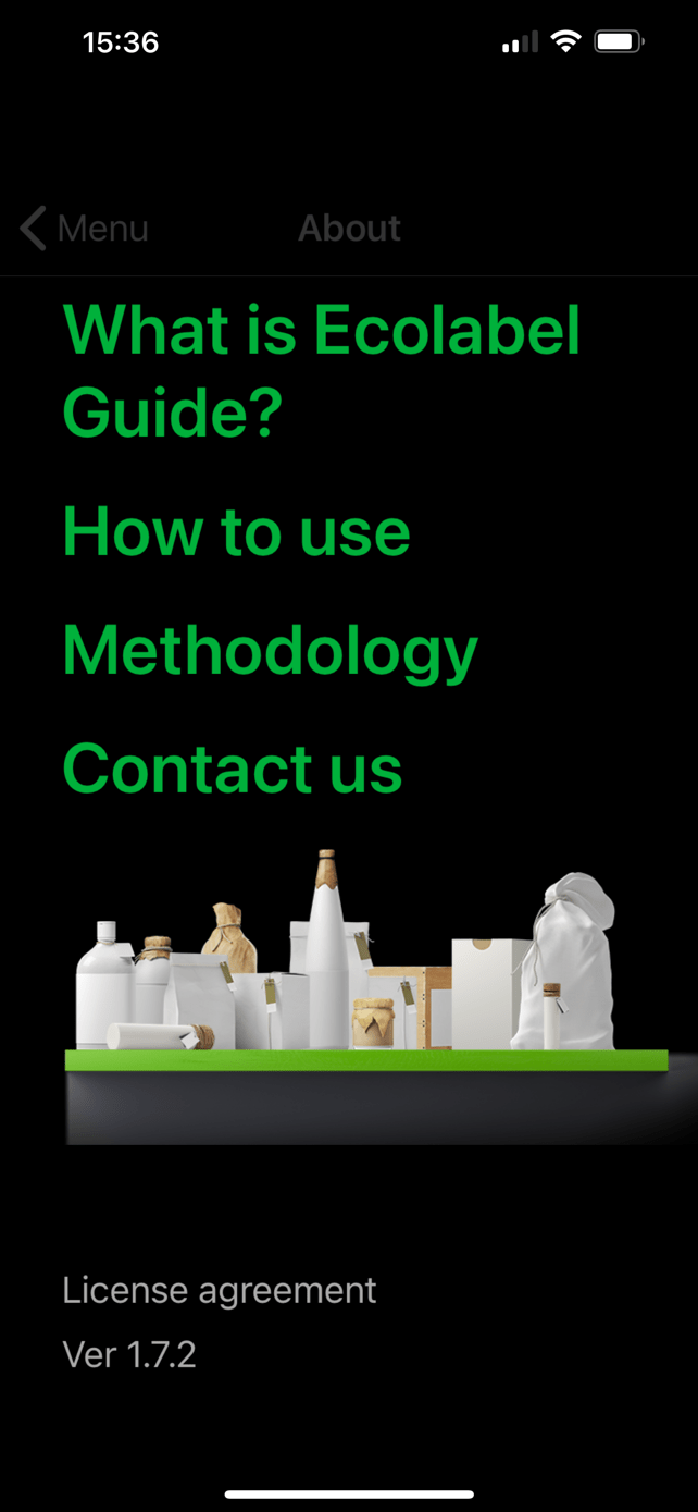 Each Item gives further information by clicking on the topic heading, such as the further information on the Ecolabel Guide, How to use the app including the scanner, the individual Ecolabel Profiles & the Ecolabels Directory, the Methodology used in the Ecolabel Guide & Contact Us information about the developers of the Guide.